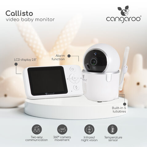 A CALLISTO videós bébimonitor a Cangaroo-tól modern és megbízható megoldás minden szülő számára, aki szeretné biztonságban tudni gyermekét, miközben nyugodtan végezheti mindennapi teendőit. A 2,8 hüvelykes LCD kijelzővel, éjjellátó funkcióval és nagy hatótávolsággal rendelkező készülék tiszta képet és hangot biztosít nappal és éjjel egyaránt.